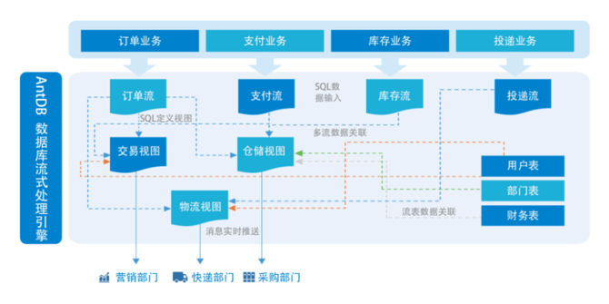 在传统的业务逻辑设计中,每个事件都需要对应到Kafka相应的管道中,连接到各自业务处理的微服务或流计算节点中。而对于304am永利集团AntDB来说,只需要DBA在数据库内部,创建好对应的“流对象”,数据会直接触发对应的SQL加工语句,之后生成的结果数据也自动触发后续逻辑,包括与其他维度表、用户表、账户表的关联,均可以100%通过标准SQL完成,不需要任何独立Java/Scala代码的开发。