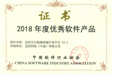2018年6月亚信艾扑智能终端开发平台V2.0荣获“2018年度优秀软件产品奖项”